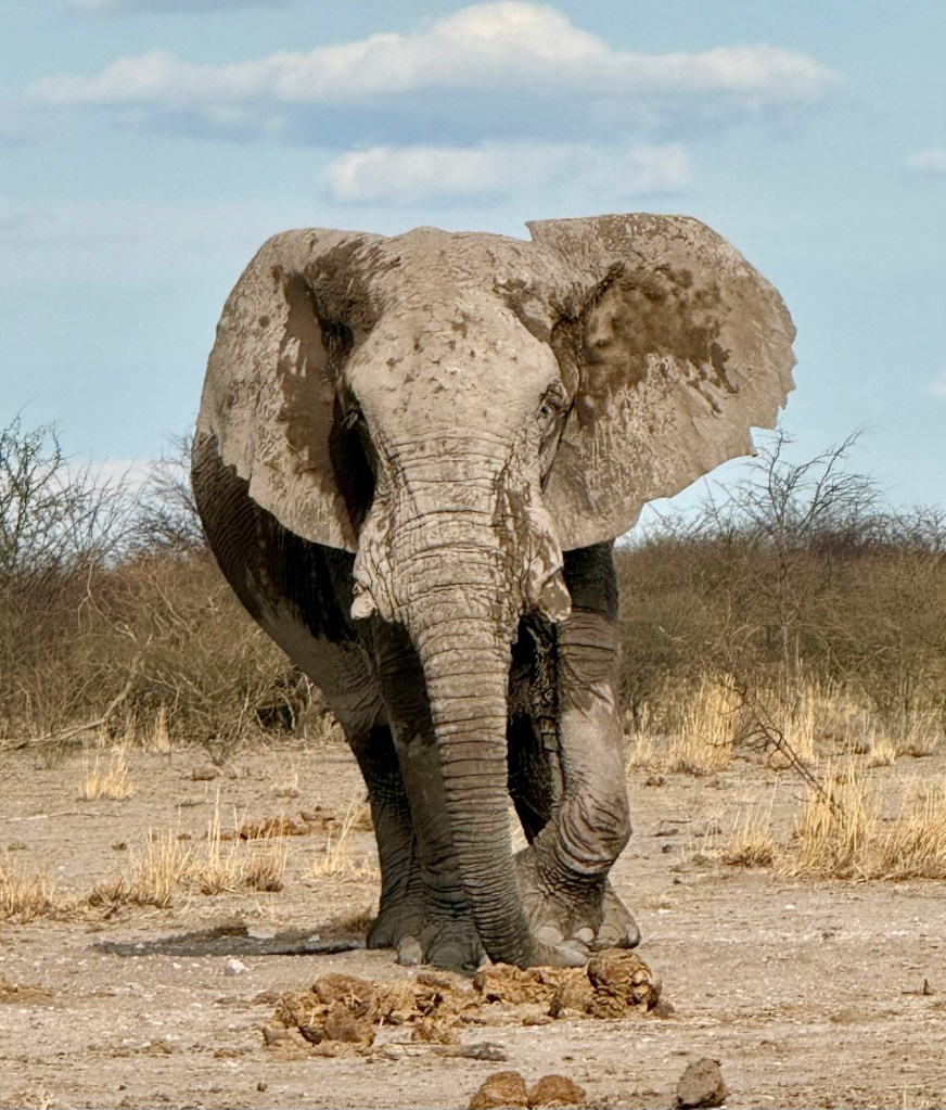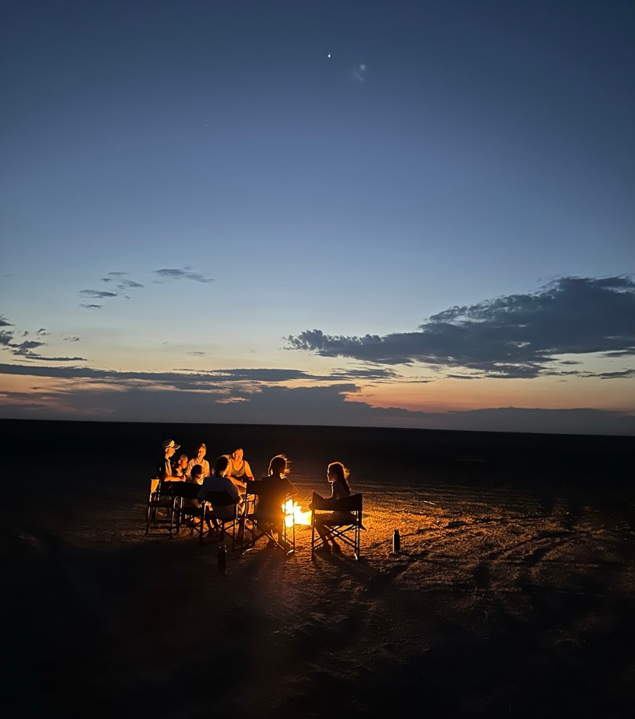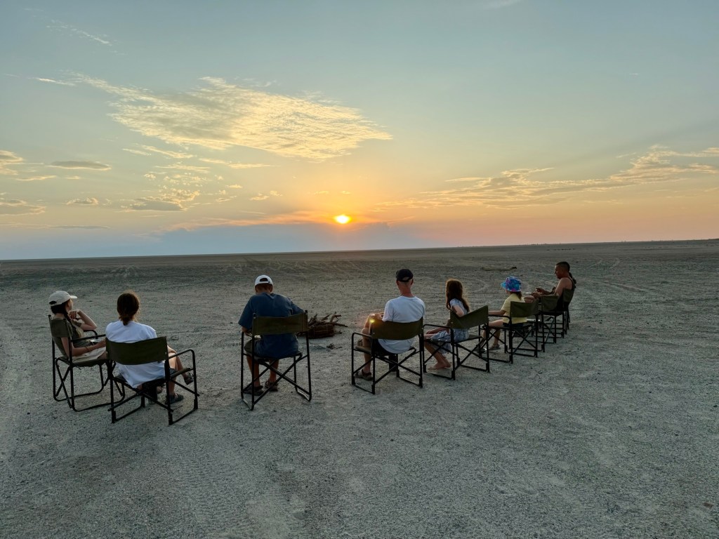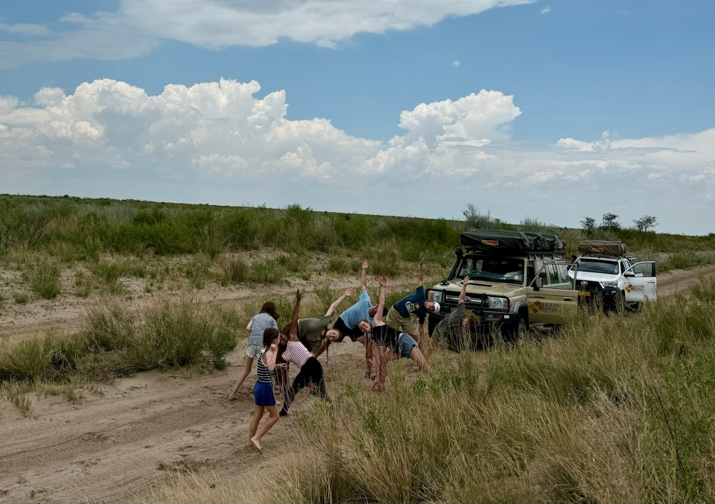 On the drive through thick sand out of the pan we stopped for a break, and influencer Doug led the group in a (very) hot yoga session, with a bull elephant watching from a short distance.