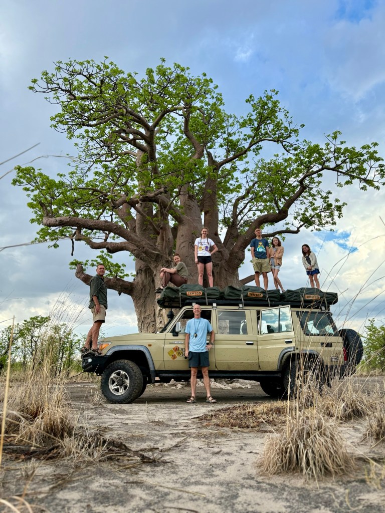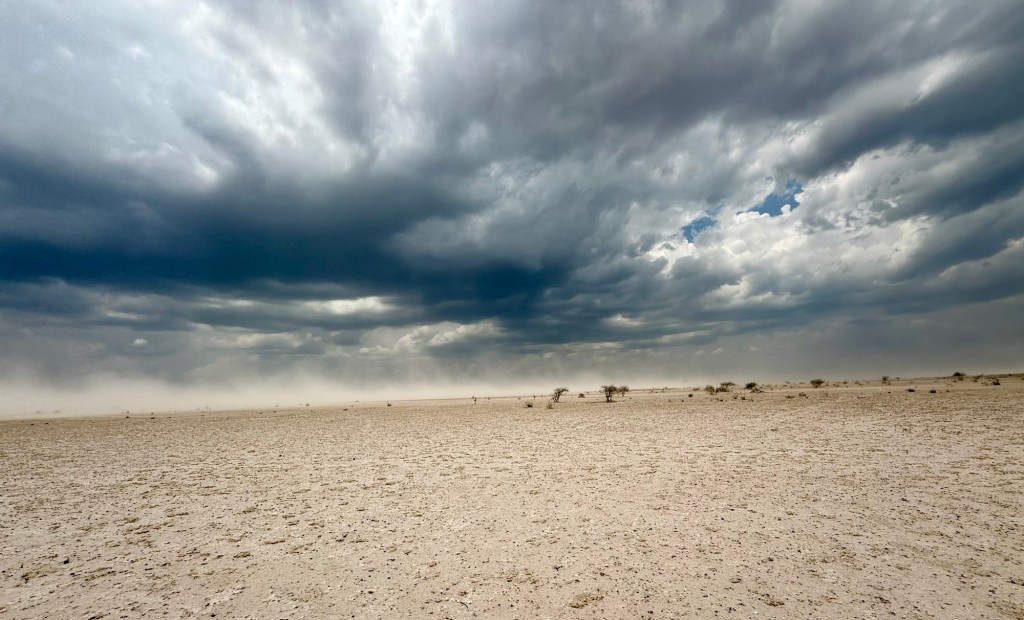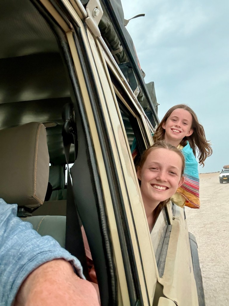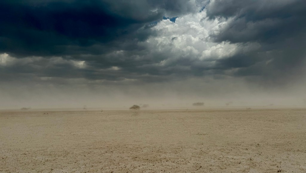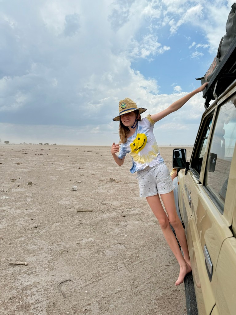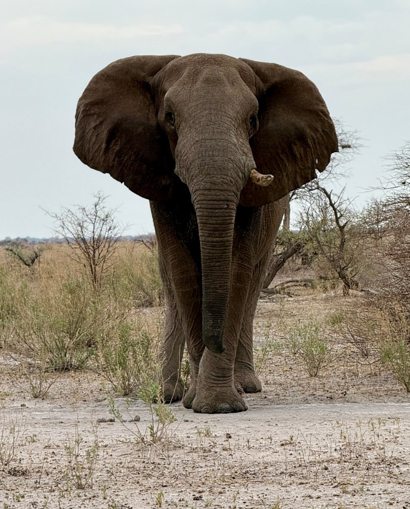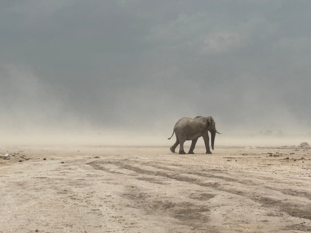 We’ve been to Nxai Pan 30 times over the years, but each time is different. This time we arrived at the end of the dry season, in a drought year. As we drove out to the waterhole, which is the only standing water for 50kms, we were hit by a dust storm that blocked out the sky. We put some kids on the roof and drove into it blind (as you do). It was getting a bit overwhelming, when out of the dust strode a huge bull elephant.
