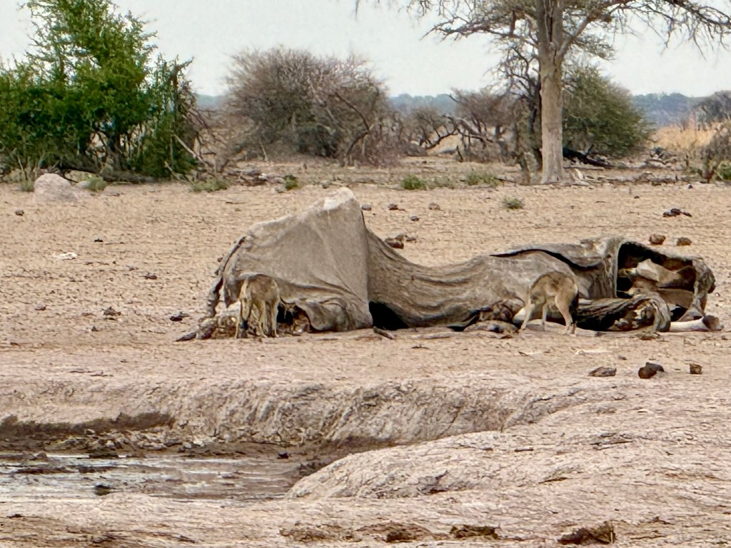 Late in the afternoon we went on another drive around and ended with a cold drink at the waterhole, watching 3 jackals and a vulture picking over a well-dead elephant carcass, while 8 or so very much alive elephants came and went.