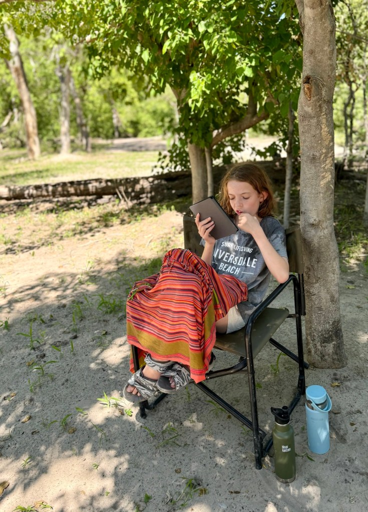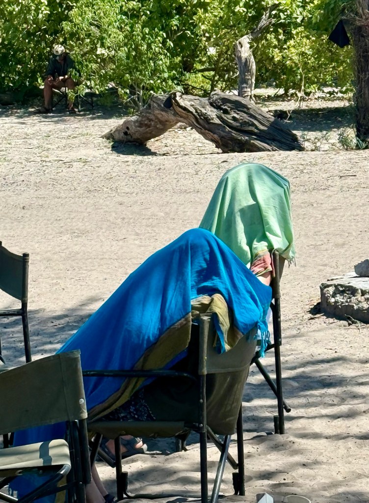 Some days we then had to move on to our next camp, but a couple of times we stayed in the same spot two nights in a row. Afternoons were for finding the deepest shade possible, doing jobs and reading. There is a quality to shade that you only appreciate when it’s 50 degrees in the direct sun. The difference between a big mature tree, and some dappled light coming through a reasonable bush is about 4 degrees. We had plenty of water, and the water chilling system was our most important process. We also routinely soaked our shirts, or lived under soaked kikoi to get through the afternoons.