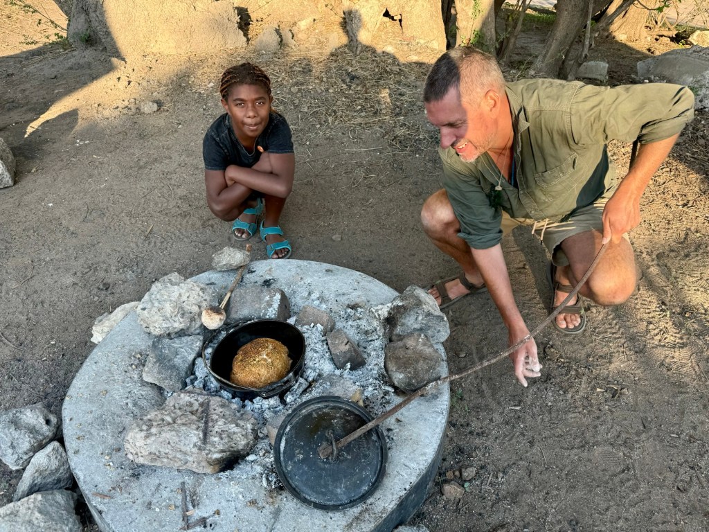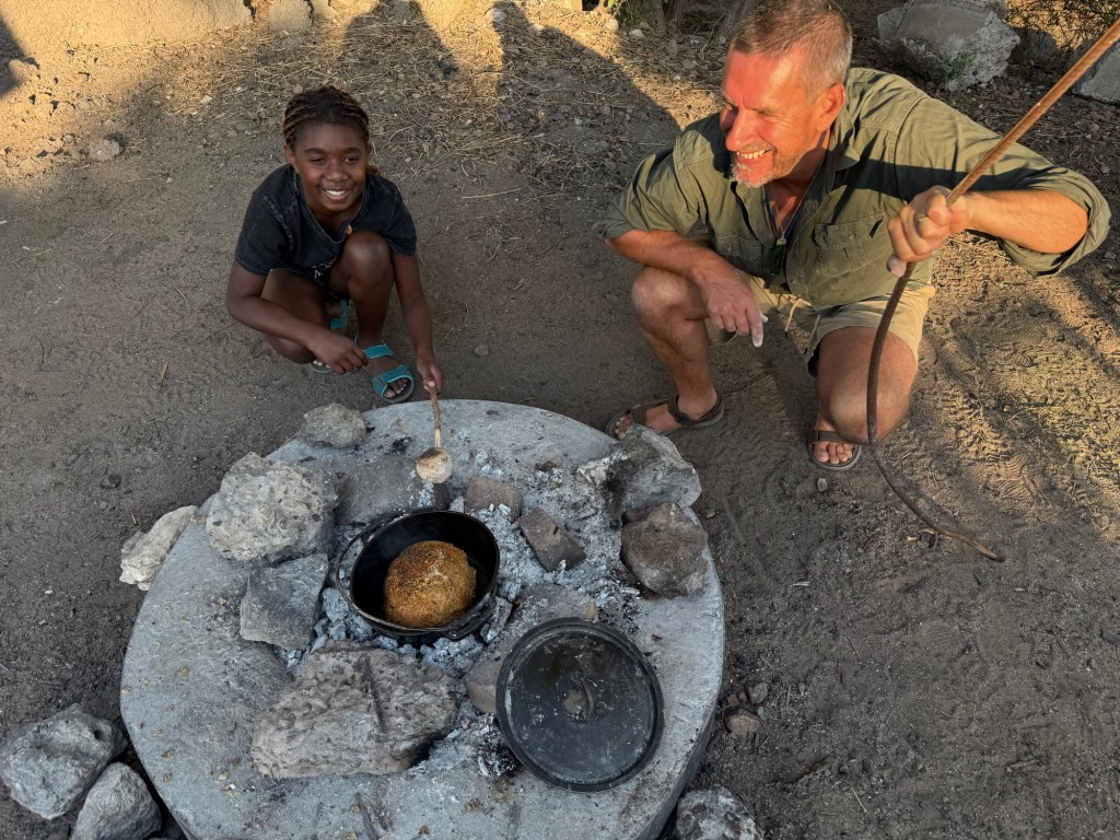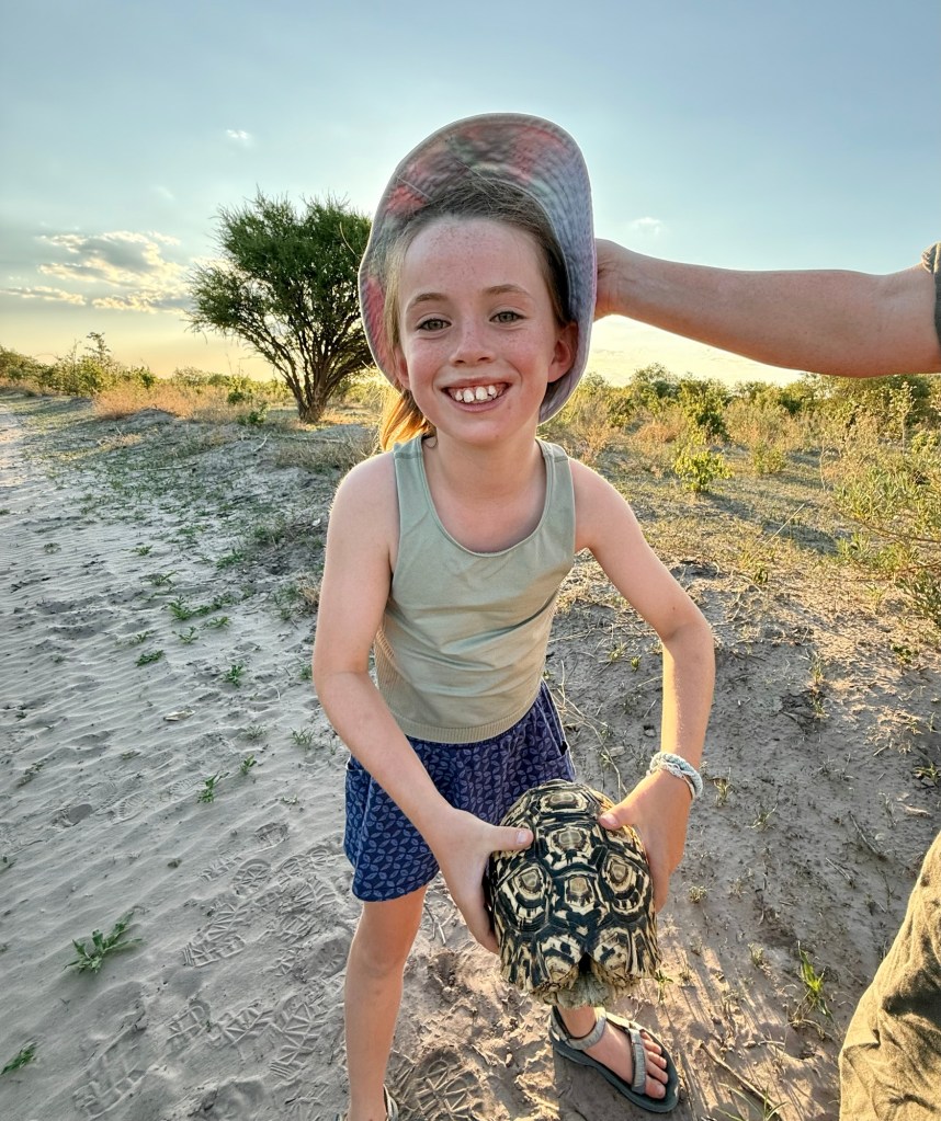 But we’ve also had amazing experiences with the smaller creatures. We stopped for 20 mins to watch dung beetles doing their thing with a steaming pile of elephant dung. We had a colony of dwarf mongeese under our kitchen bench for two days in Savuti, Emma and Pam have nearly had hornbills taking crackers out of their hands. We’ve found three tortoise, lumbering at snails pace across the plains- including one heading for the river 100m away that Leanne and Fenn decide to feed our precious water out of a breakfast bowl instead, saving him about two hours round trip (I wonder how many tourists he’s tried that act on?). And we sat and watched a big monitor lizard dig a hole to lay her eggs.